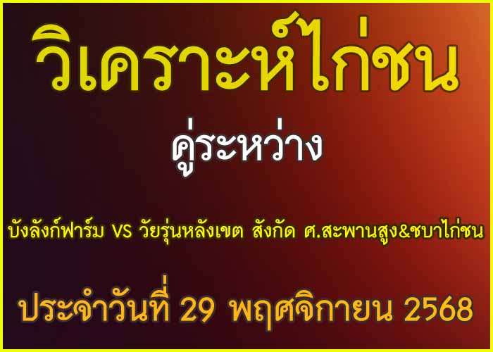 วิเคราะห์ไก่ชน คู่ระหว่าง บังลังก์ฟาร์ม VS วัยรุ่นหลังเขต สังกัด ศ.สะพานสูง&ชบาไก่ชน ประจำวันที่ 29 พฤศจิกายน 27 พฤศจิกายน 2025