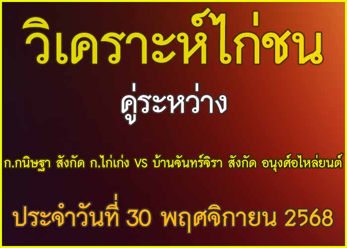 วิเคราะห์ไก่ชน คู่ระหว่าง ก.กนิษฐา สังกัด ก.ไก่เก่ง VS บ้านจันทร์จิรา สังกัด อนุงศ์อไหล่ยนต์ ประจำวันที่ 27 พฤศจิกายน 2025