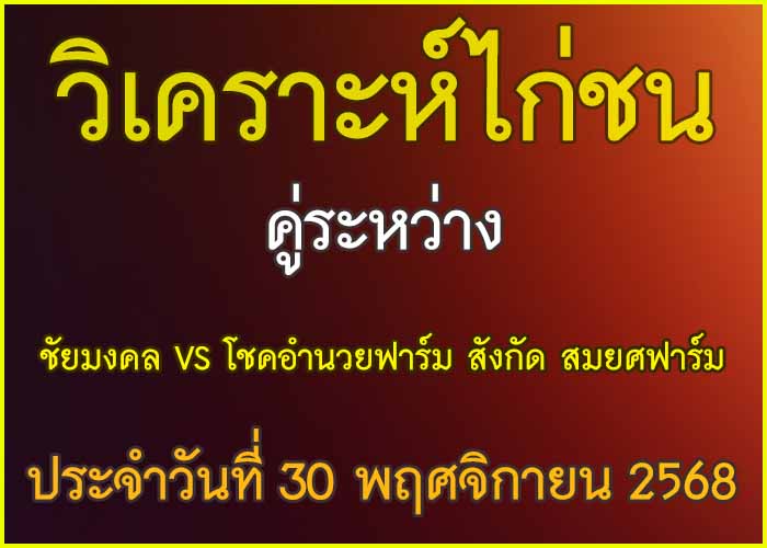 วิเคราะห์ไก่ชน คู่ระหว่าง ชัยมงคล VS โชคอำนวยฟาร์ม สังกัด สมยศฟาร์ม ประจำวันที่ 30 พฤศจิกายน 27 พฤศจิกายน 2025