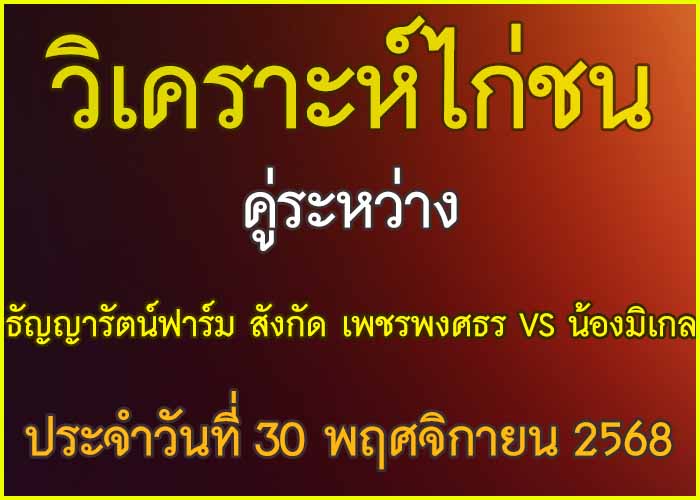 วิเคราะห์ไก่ชน คู่ระหว่าง น้องมิเกล VS ธัญญารัตน์ฟาร์ม สังกัด เพชรพงศธร ประจำวันที่ 30 พฤศจิกายน 27 พฤศจิกายน 2025