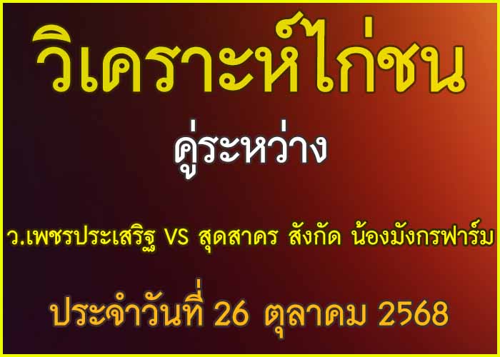 วิเคราะห์ไก่ชน คู่ระหว่าง ว.เพชรประเสริฐ VS สุดสาคร สังกัด น้องมังกรฟาร์ม ประจำวันที่ 26 ตุลาคม 21 ตุลาคม 2025