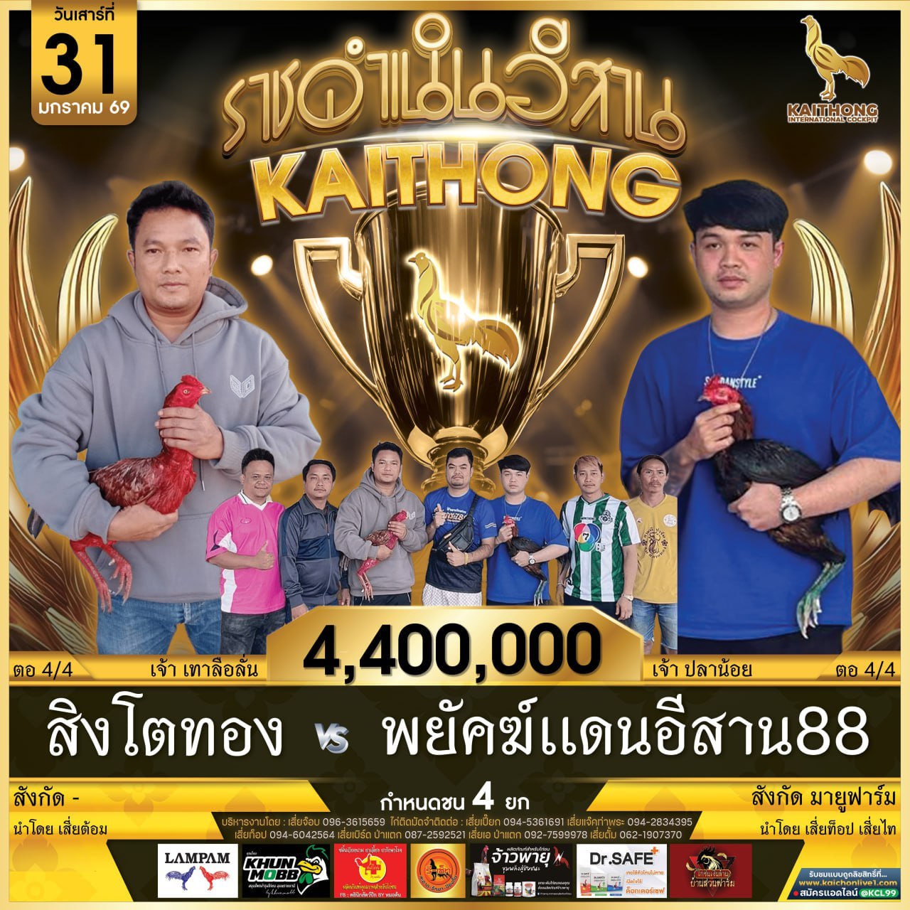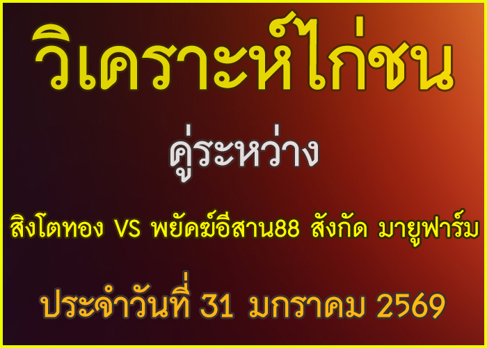 วิเคราะห์ไก่ชน คู่ระหว่าง สิงโตทอง VS พยัคฆ์อีสาน88 สังกัด มายูฟาร์ม ประจำวันที่ 31 มกราคม 29 มกราคม 2026